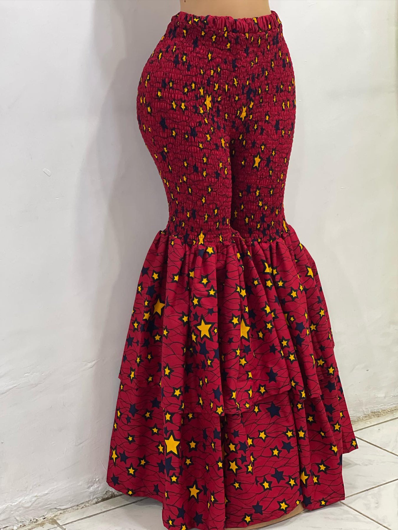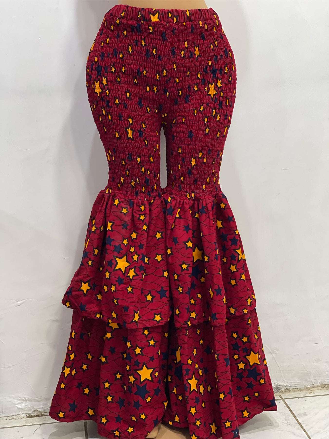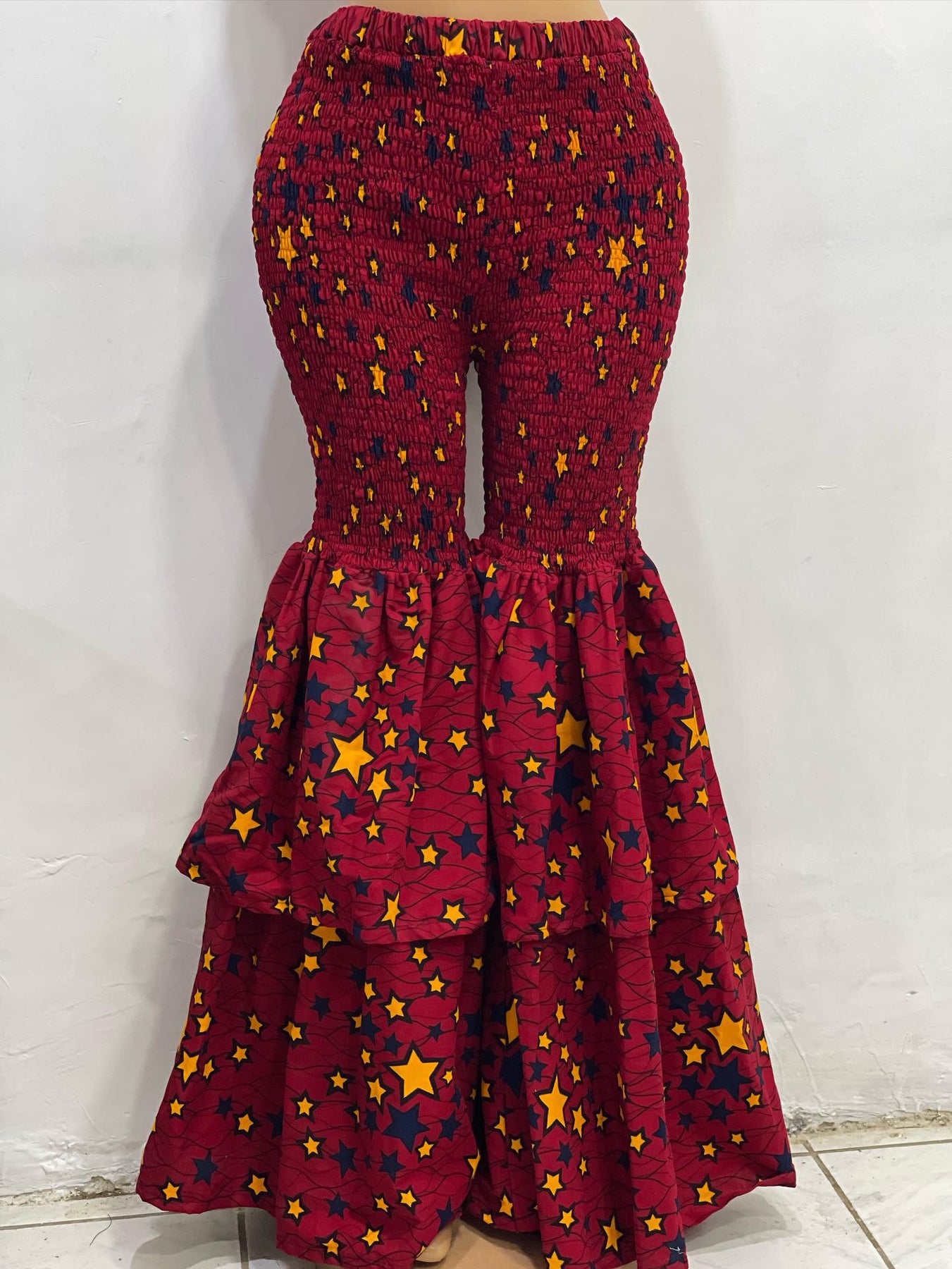This beautiful flare legs pant is made with beautiful African Ankara print material. The pant has elastic from waist to knees and the bottom is a full flare leg. It’s stretchy and fits any body type like a glove. Very long to the floor. Two full layers at the bottom.