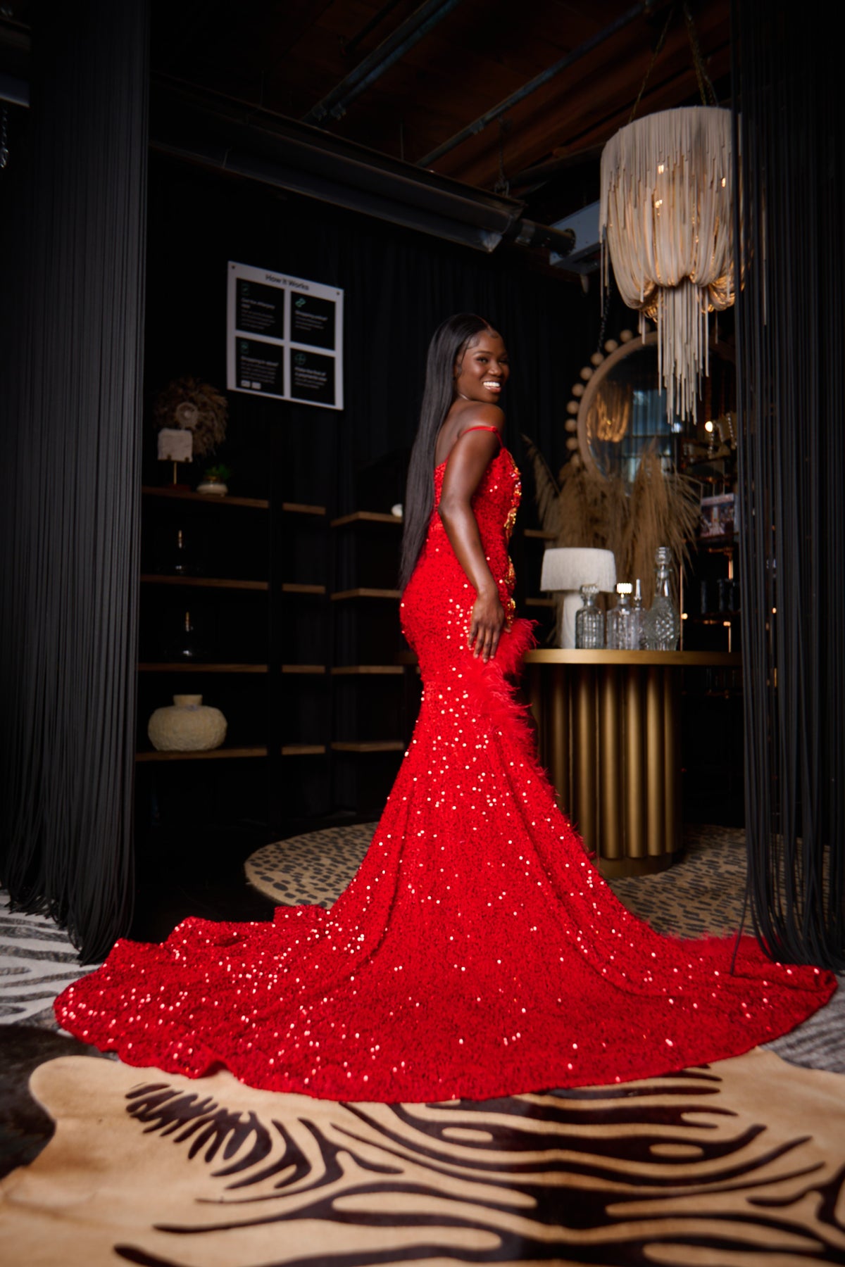 Red Velvet Sequins Prom Dress With Red Bodice Rhinestones.