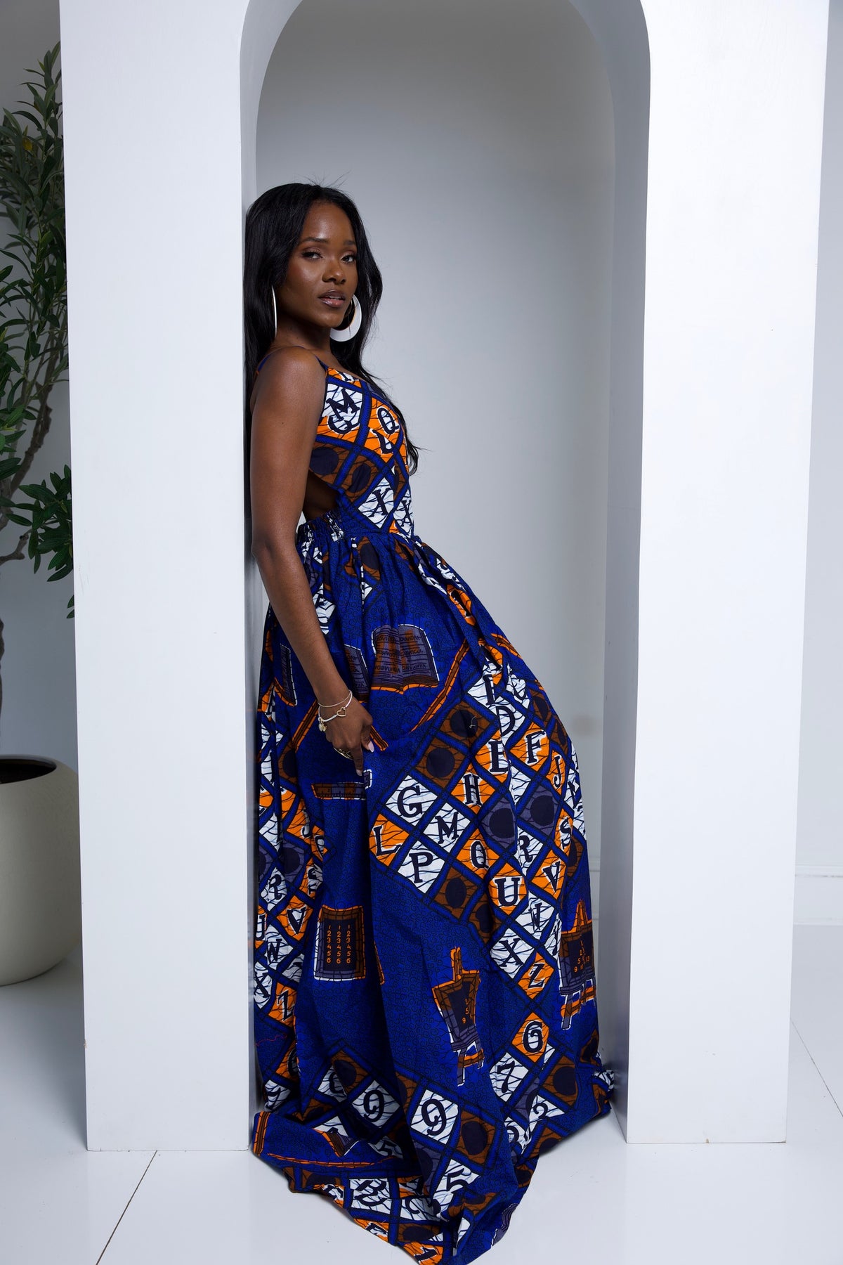African print long maxi dress with open bareback.