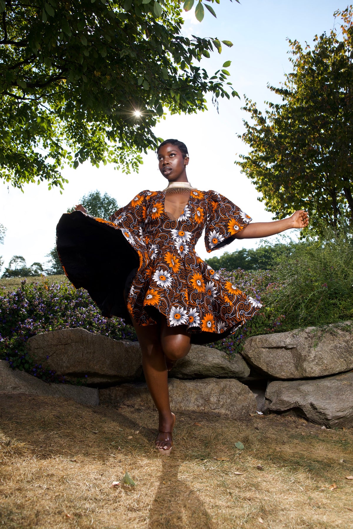 Beautiful African print Plunge float sleeve dress with extra flare circle skirt.