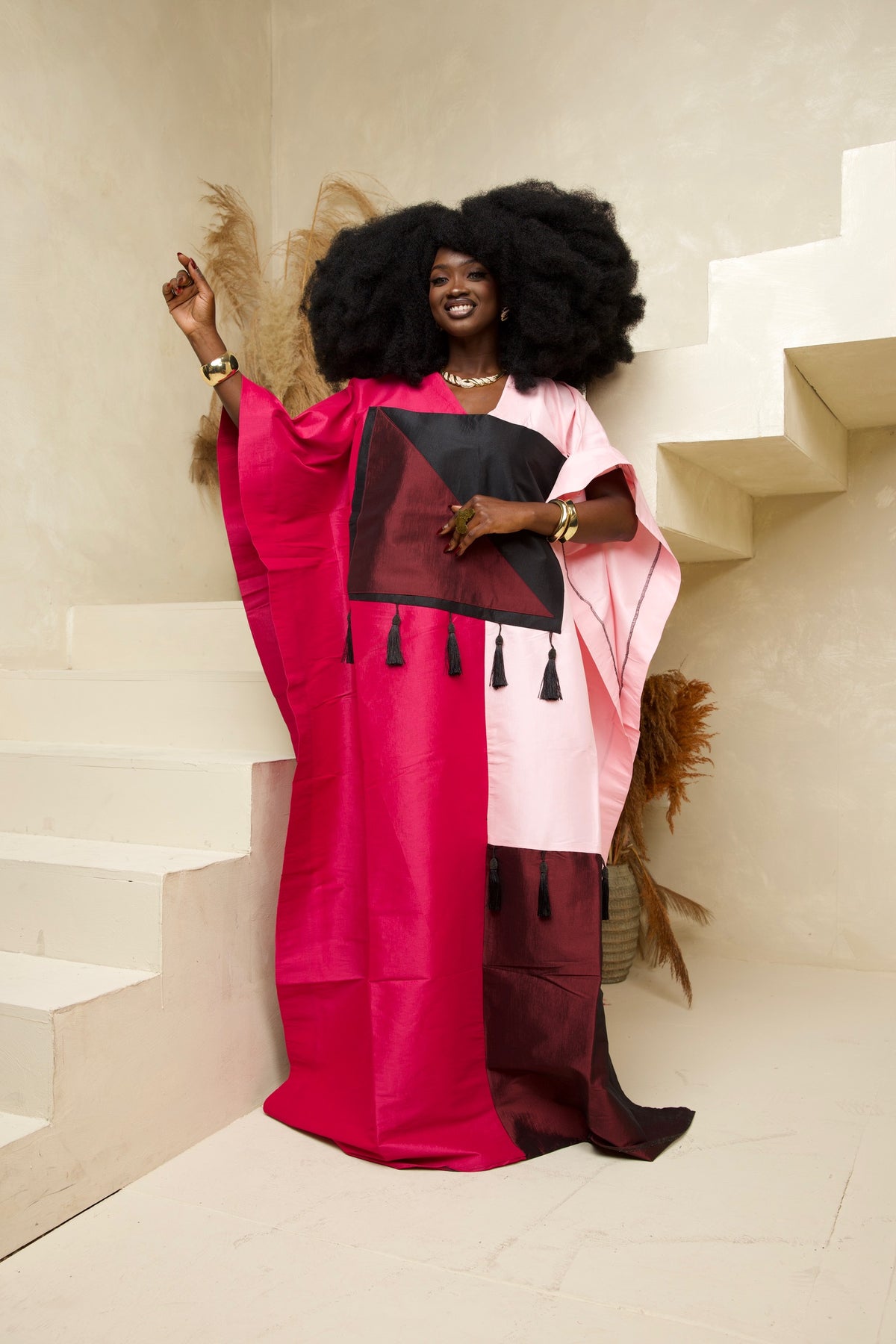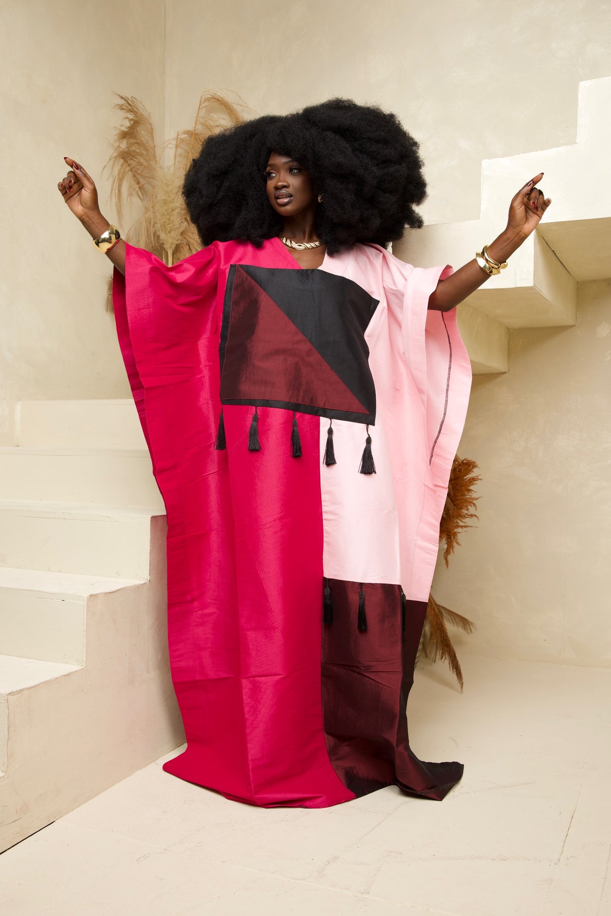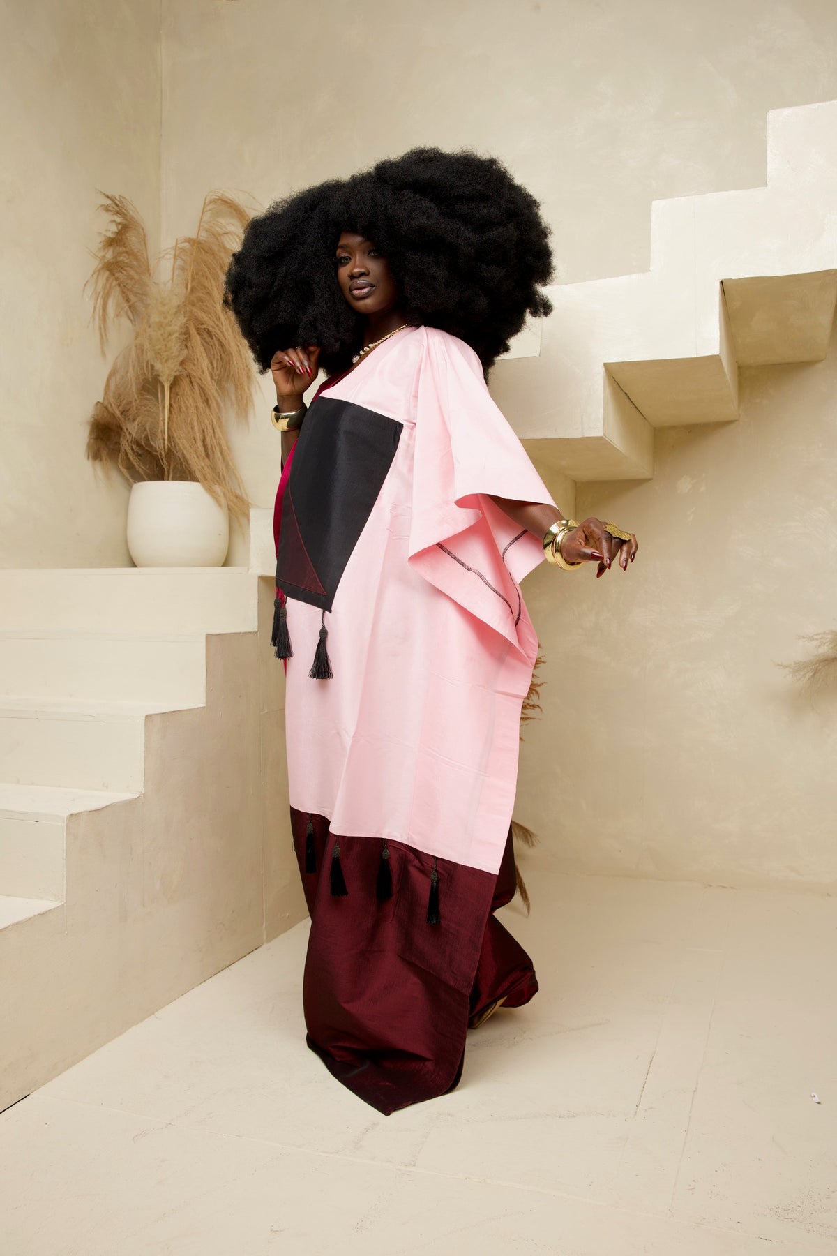 Radiate elegance in our pink and wine taffeta bubu gown with matching large headwrap, a bold statement of African luxury and heritage. Crafted from premium taffeta fabric, this gown is designed to flow effortlessly with a luminous sheen that reflects beauty and sophistication.