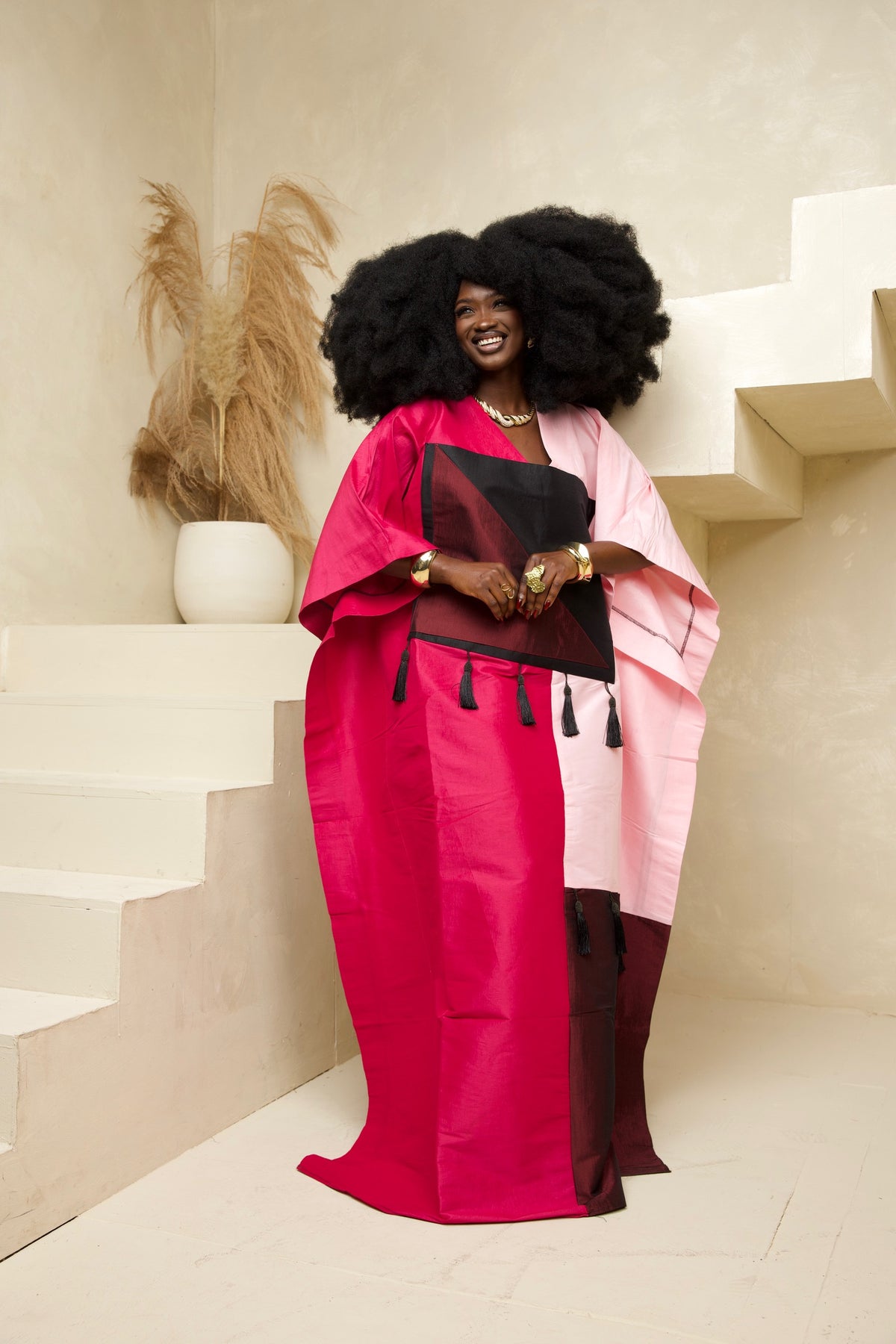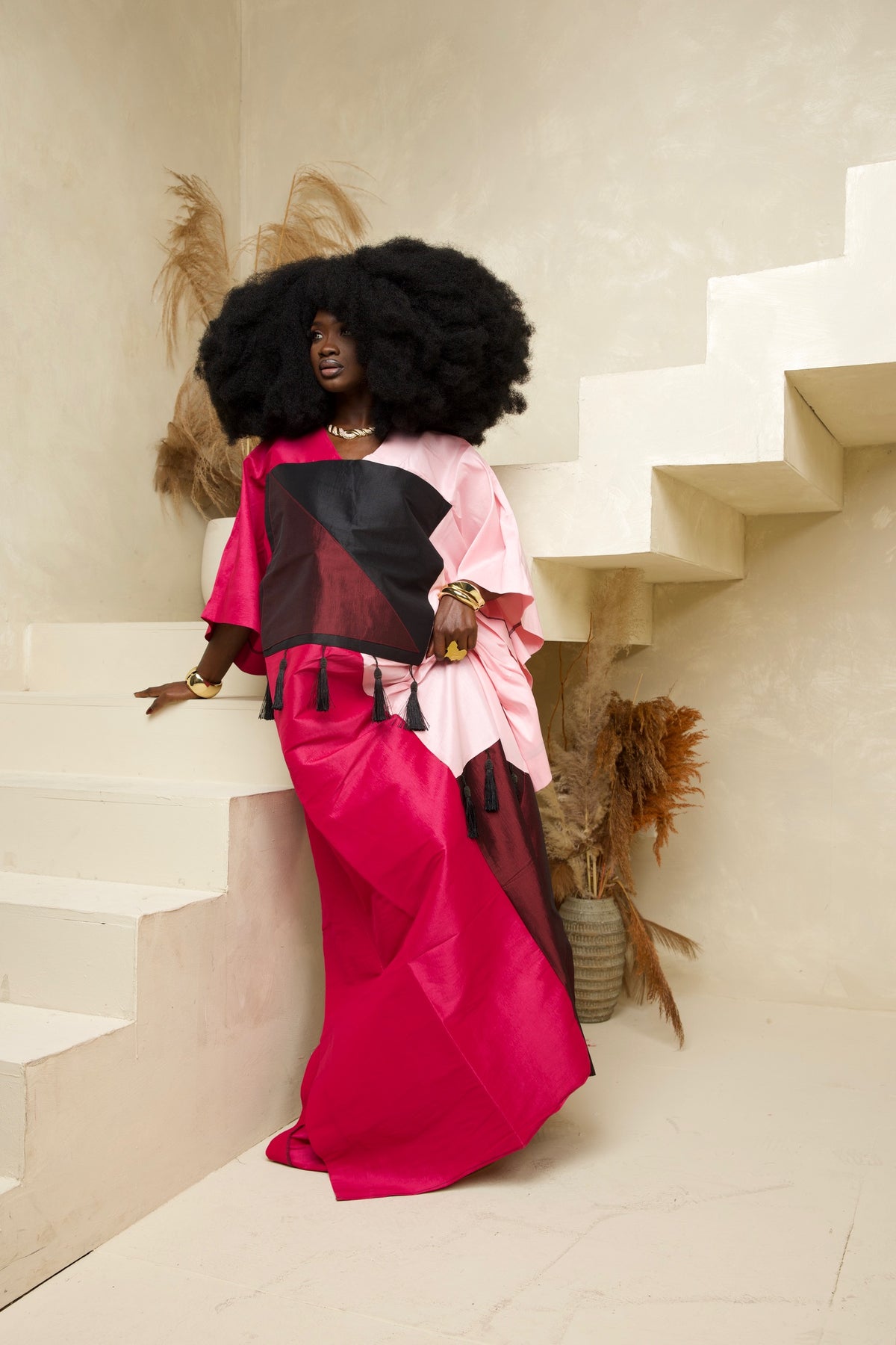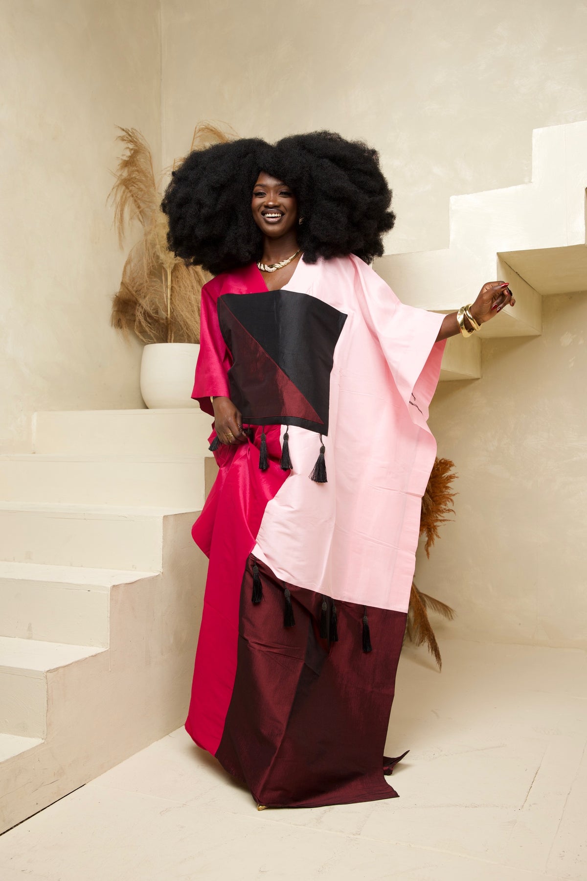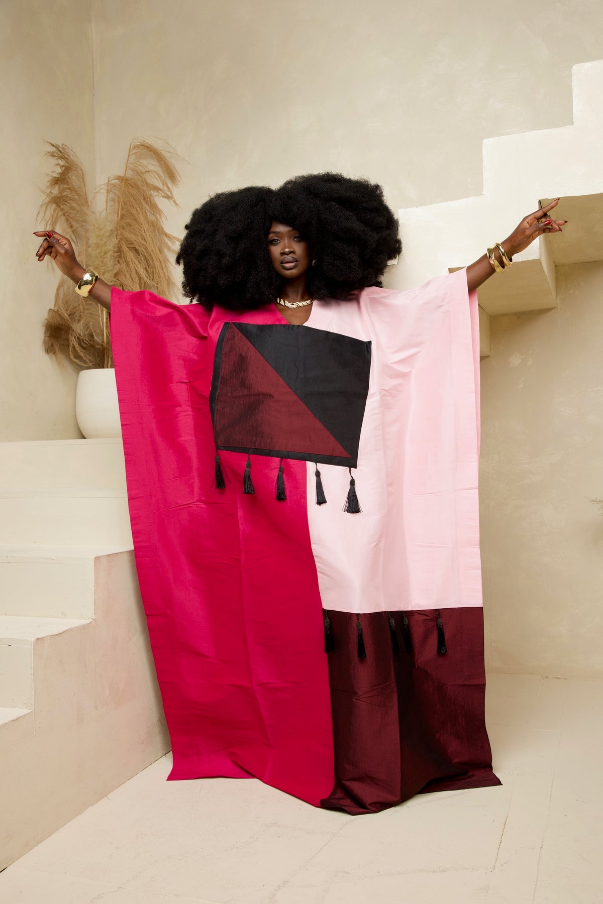 Radiate elegance in our pink and wine taffeta bubu gown with matching large headwrap, a bold statement of African luxury and heritage. Crafted from premium taffeta fabric, this gown is designed to flow effortlessly with a luminous sheen that reflects beauty and sophistication.