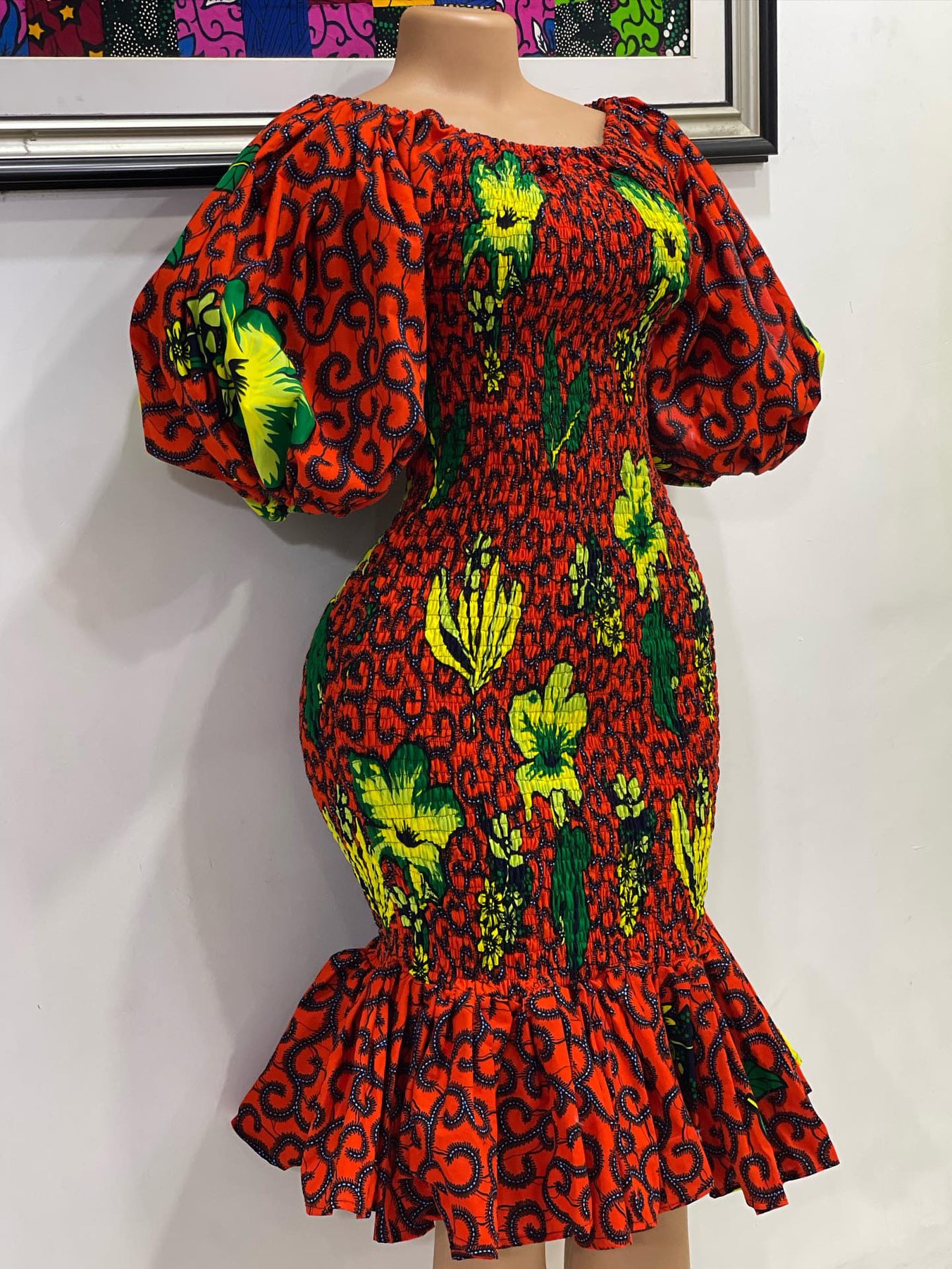 African print smoke body-con dress with puffy sleeves.