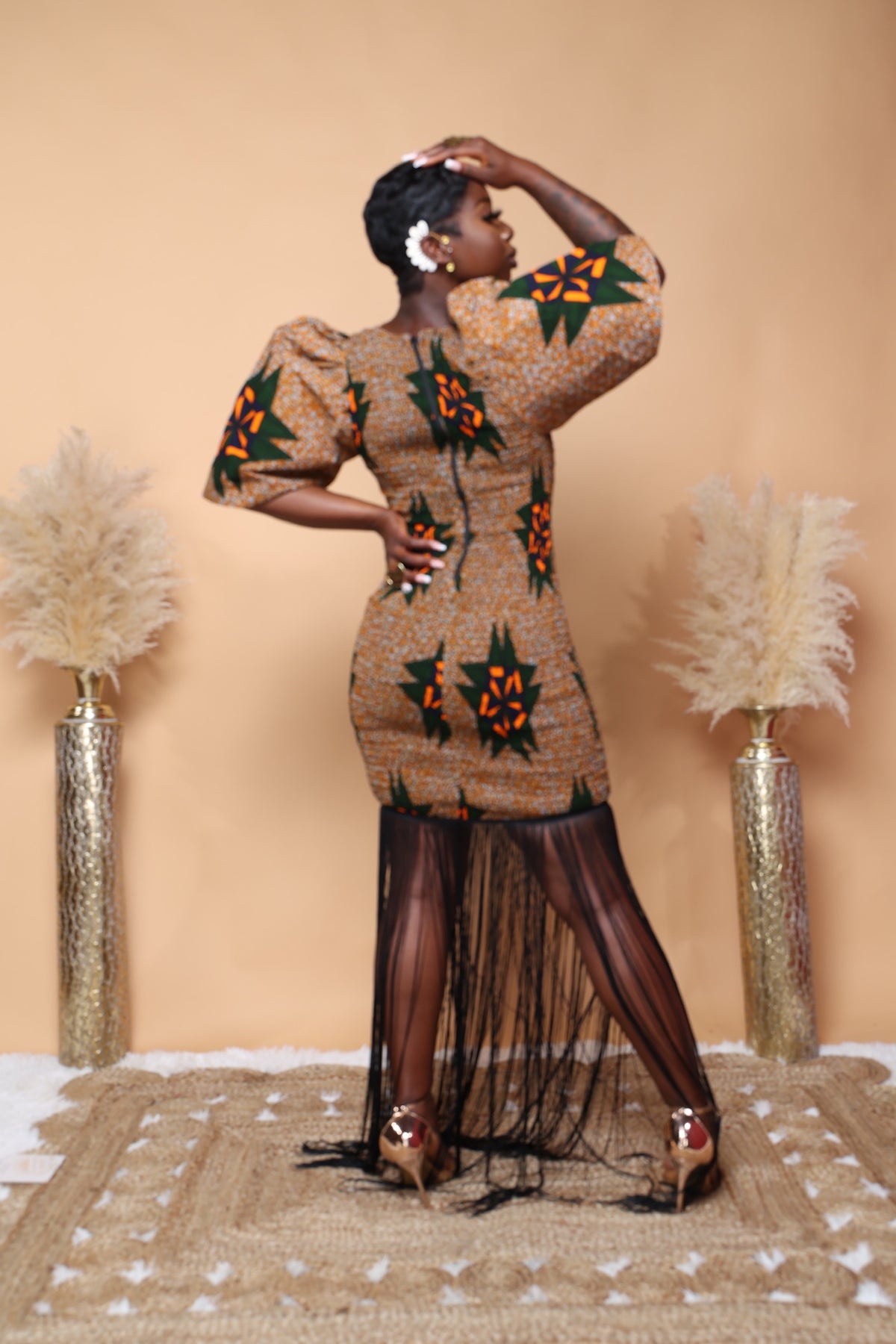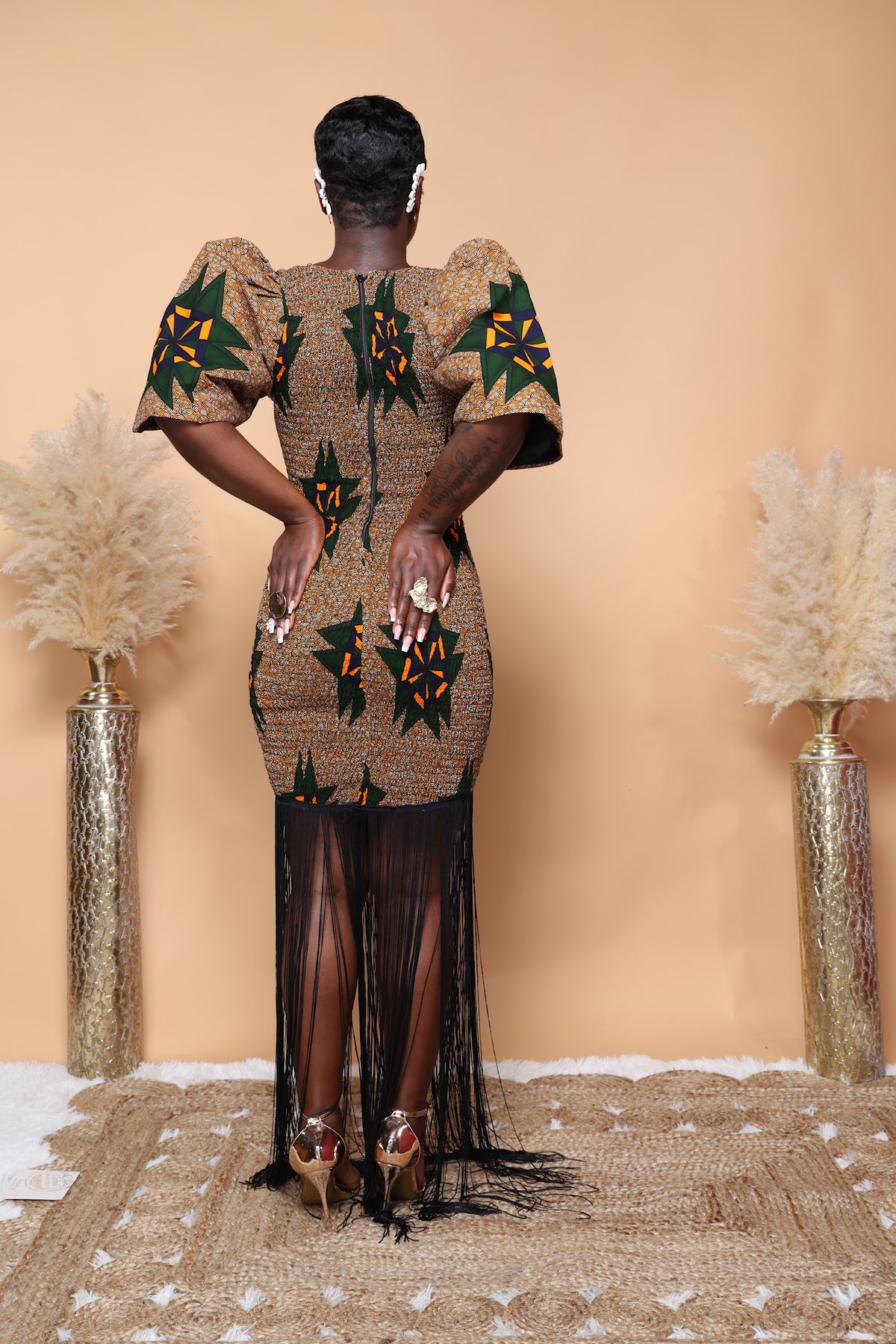 Unleash your inner queen with this beautiful African print stretchy Fringe Dress! This elegant, mid-length dress is crafted from comfortable African print material, perfect for any classy occasion. We used a beautiful breathable 100% cotton African fabric.