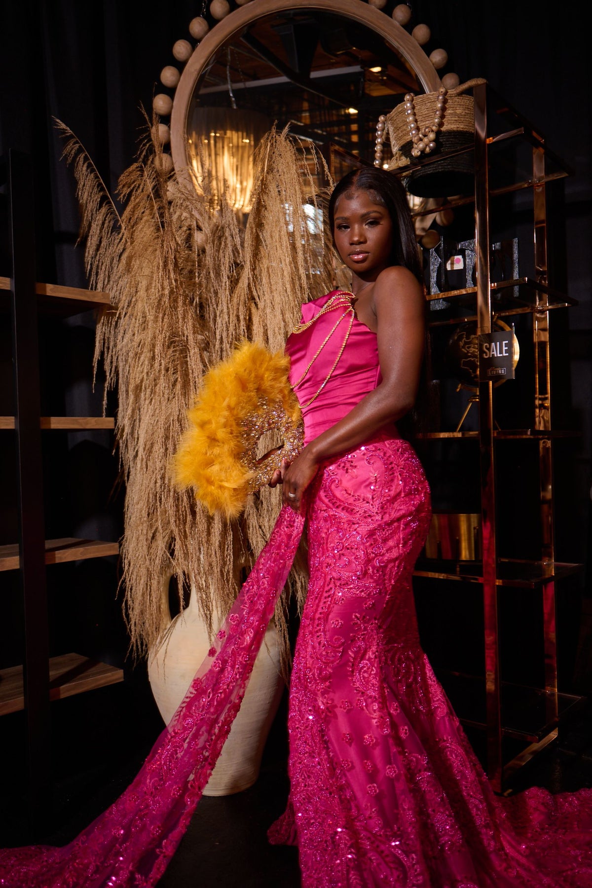 This pink luxury mermaid evening gown is made from high-quality lace, and embelisshed by hand with shophisticated rhinestones and appliques.