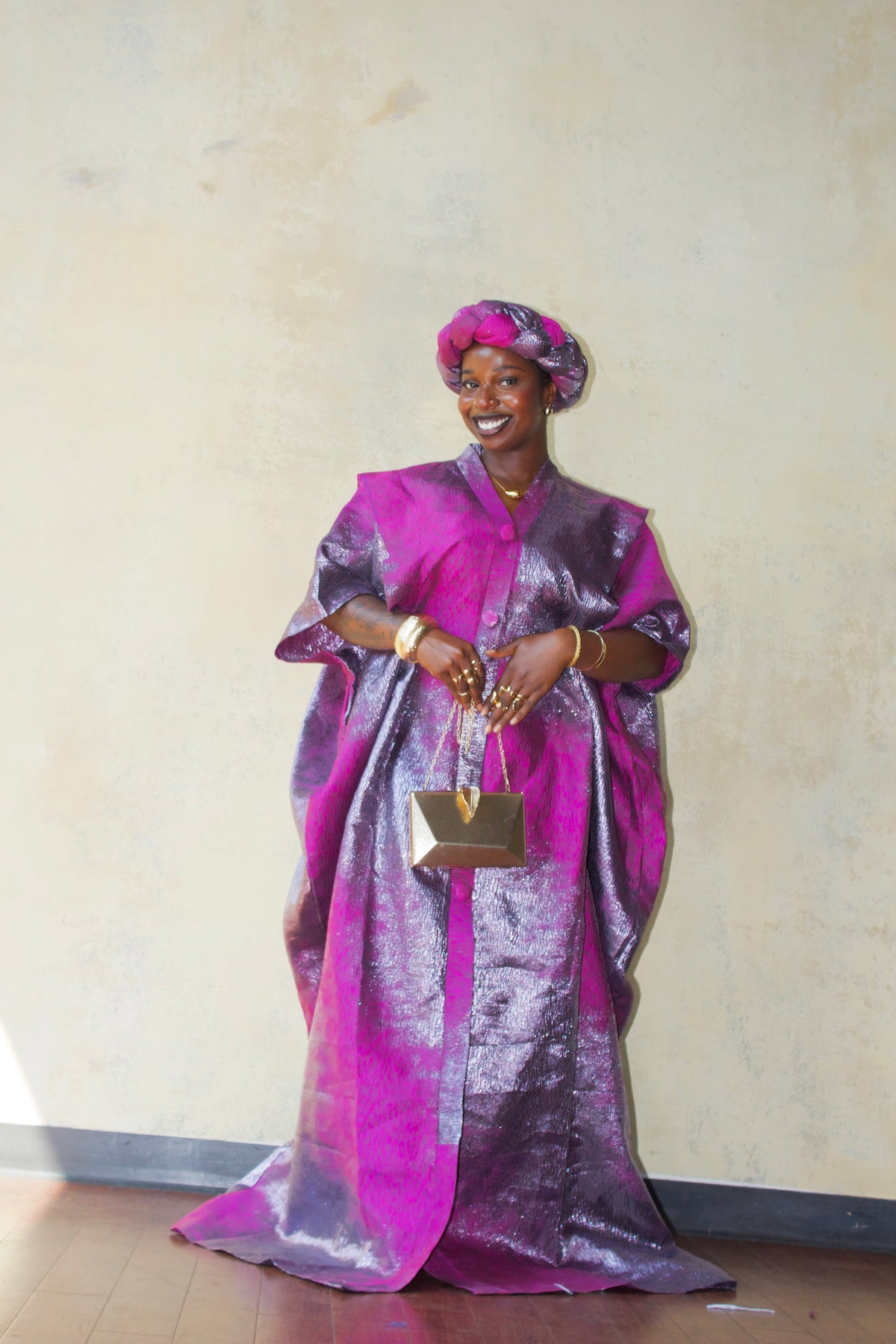 Elevate your style with this luxurious oversized brocade bubu gown, a masterpiece of elegance and tradition. Crafted from high-quality metallic brocade in vibrant fuchsia and silver, this gown drapes beautifully, offering both comfort and sophistication. The oversized fit ensures effortless grace, while the matching headwrap and button-down front add a regal finishing touch. Perfect for weddings, special events, or any occasion where you want to shine, this gown embodies timeless African luxury.