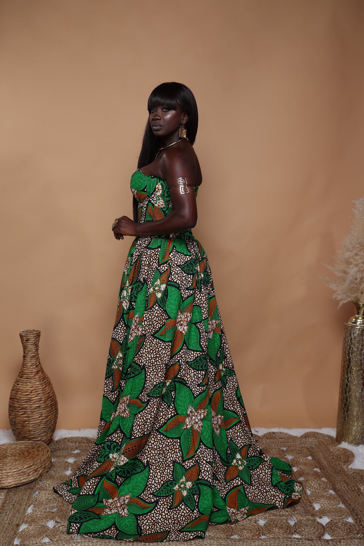 -Corseted bodice over the knee length dress in a bold African print fabric and Lined bodices