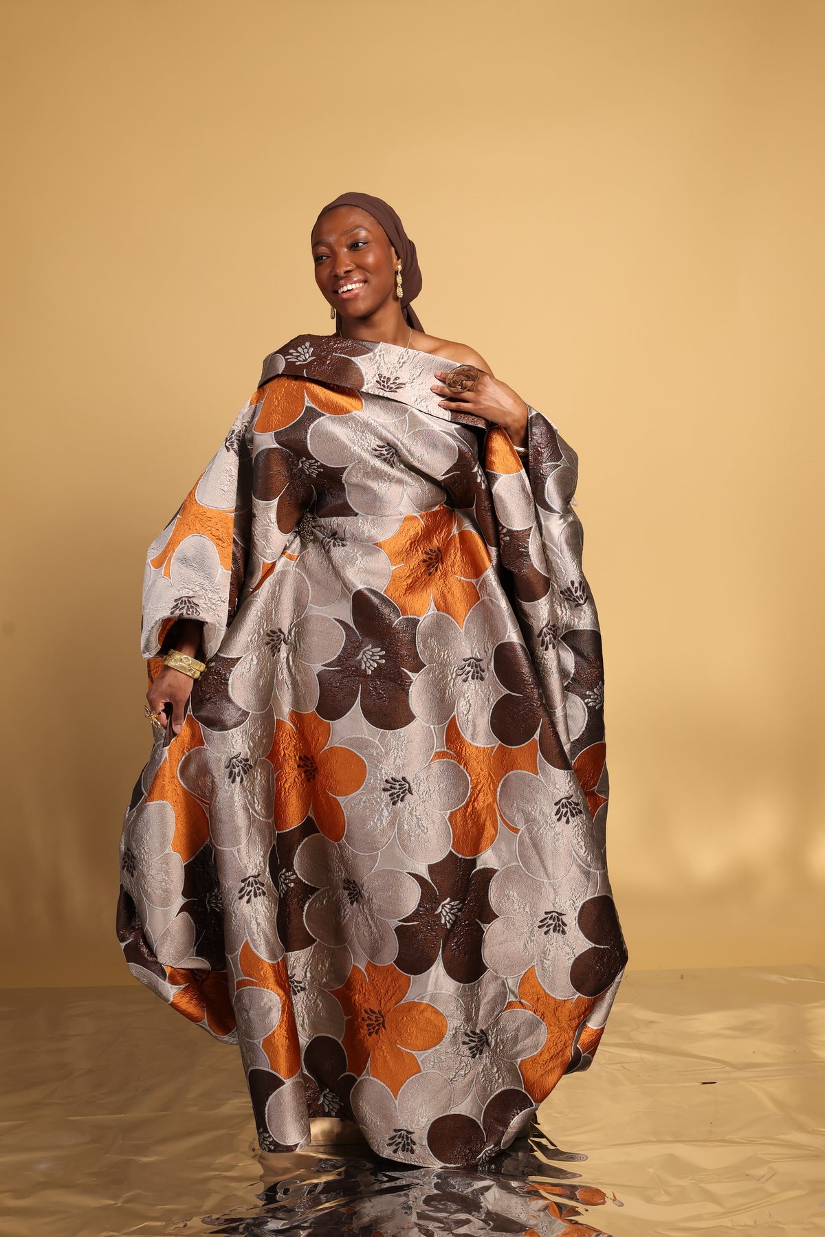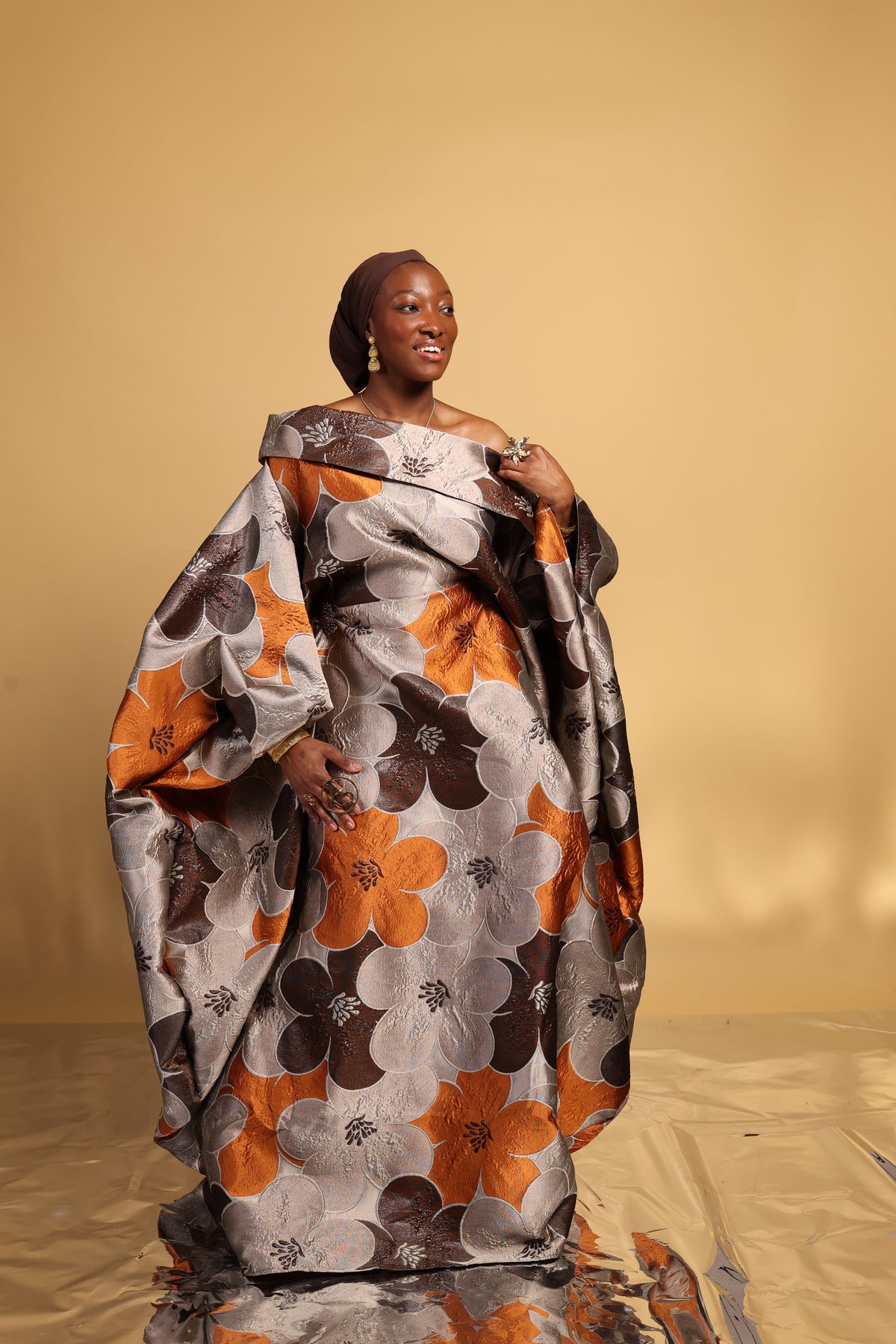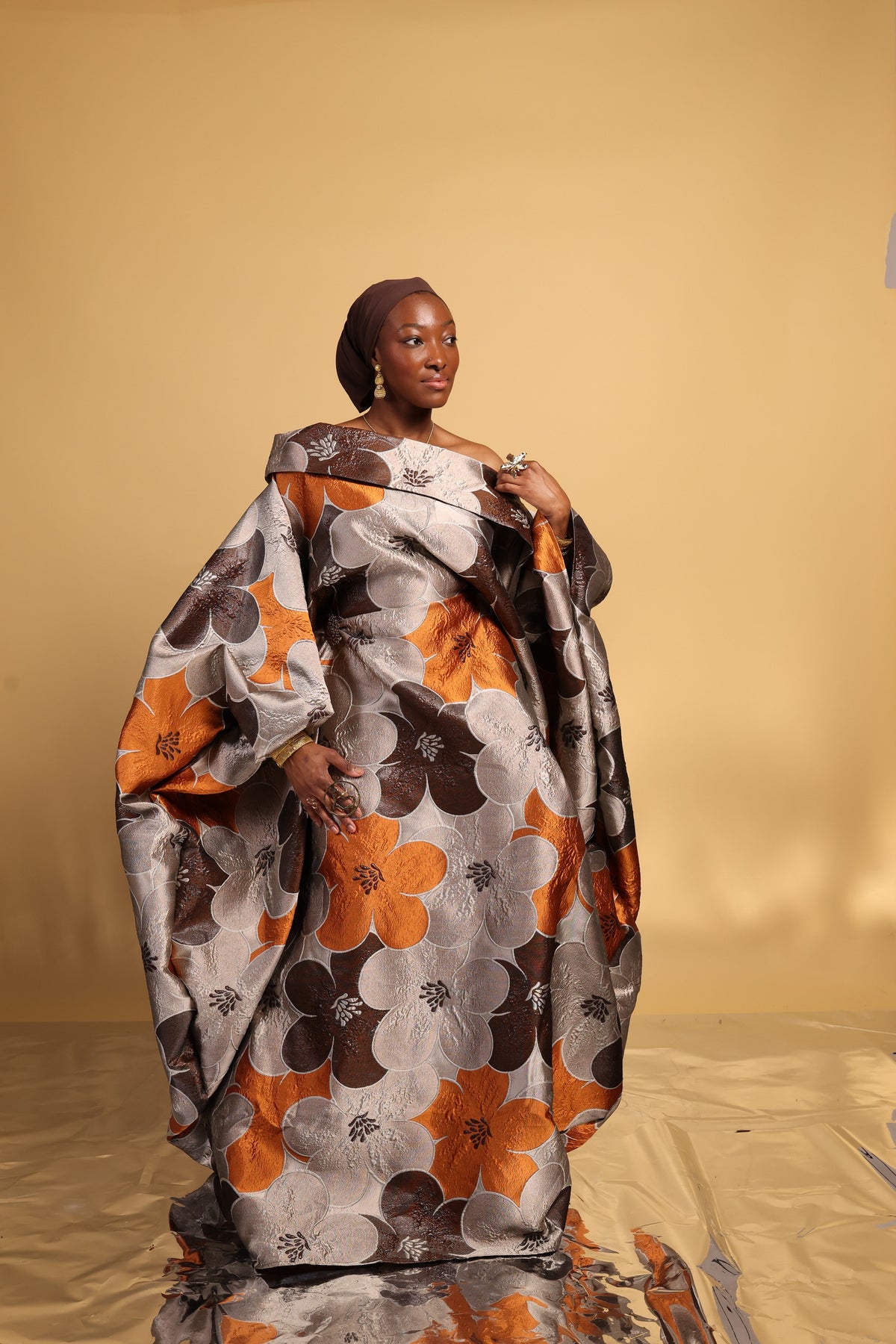This luxury Bubu is a striking blend of refined elegance and bold design. Featuring a dramatic wild boat neckline with an oversized asymmetrical collar, the silhouette creates effortless movement and regal presence. An internal adjustable waist string allows for a softly snatched fit while maintaining a graceful drape.