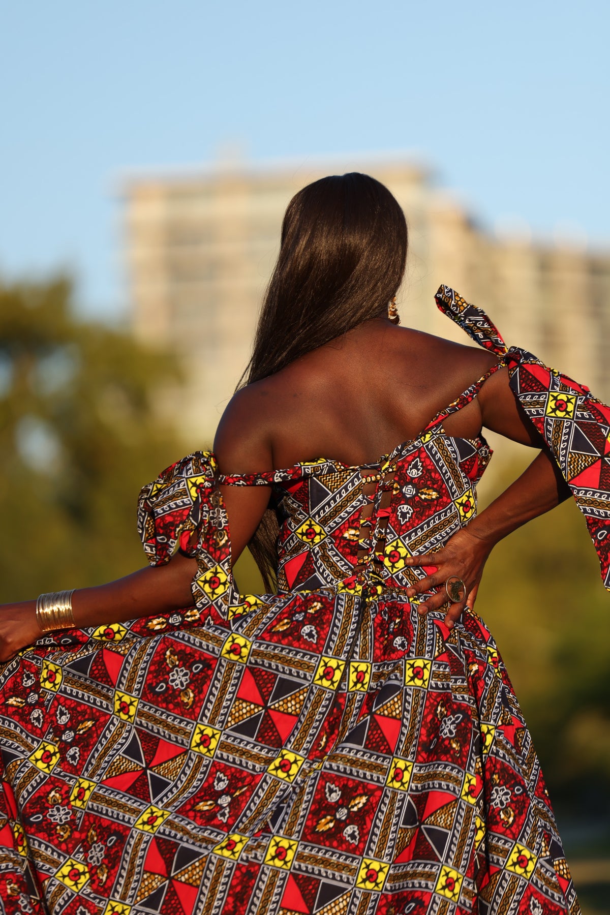 African print corset long maxi dress with tie on sleeves.
