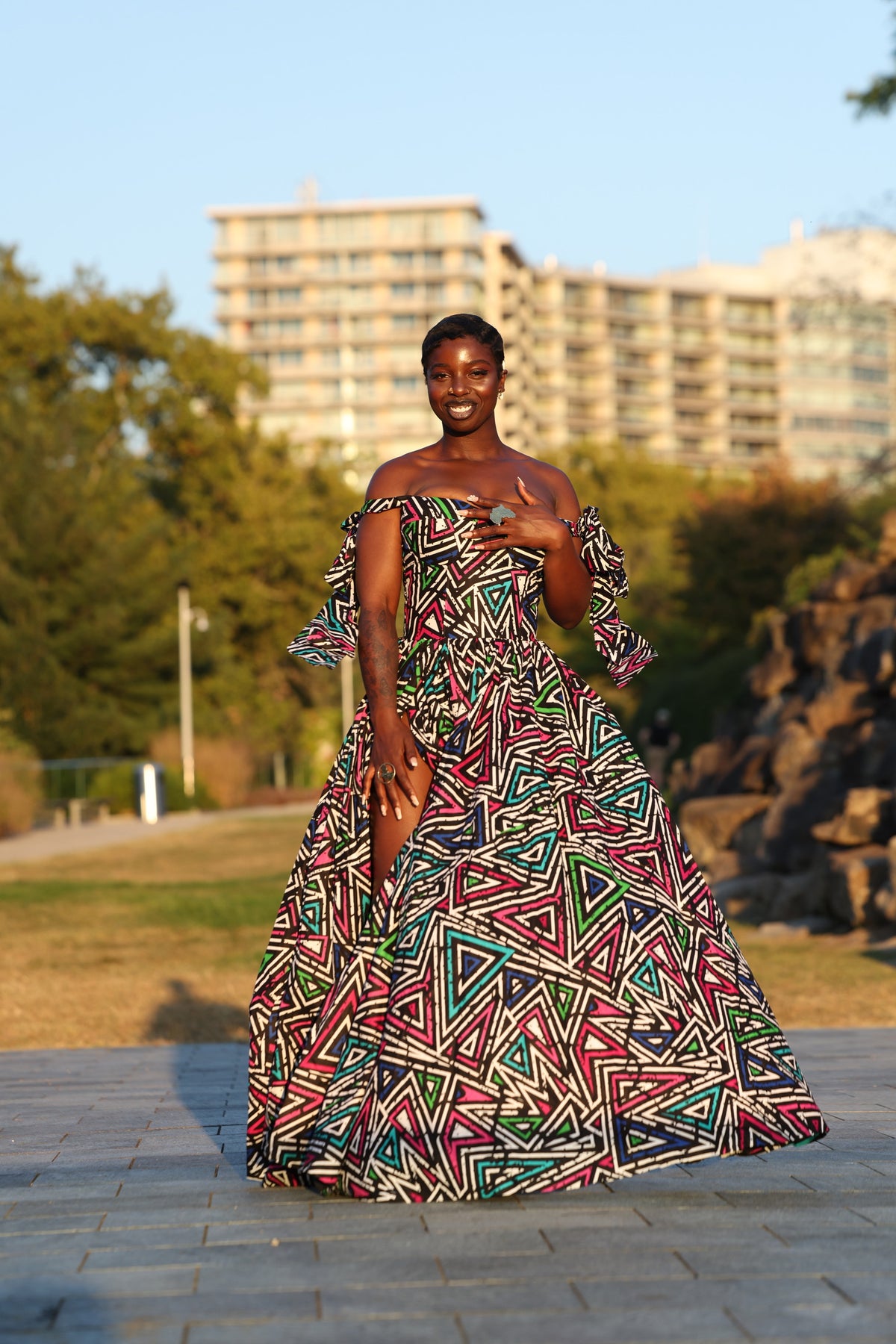 -Step into elegance with our beautiful corset African Print Floor Length Maxi Dress, a stunning fusion of tradition and contemporary style. Crafted from exquisite African fabric, this dress showcases a vibrant and intricate print that celebrates the rich cultural heritage of the region. The tied spaghetti sleeves on the shoulder or off the shoulder adds a modern twist, providing a unique and eye-catching silhouette that flatters every figure. This beauty has zipper and corset at the back to help you snatch that waist sis.
