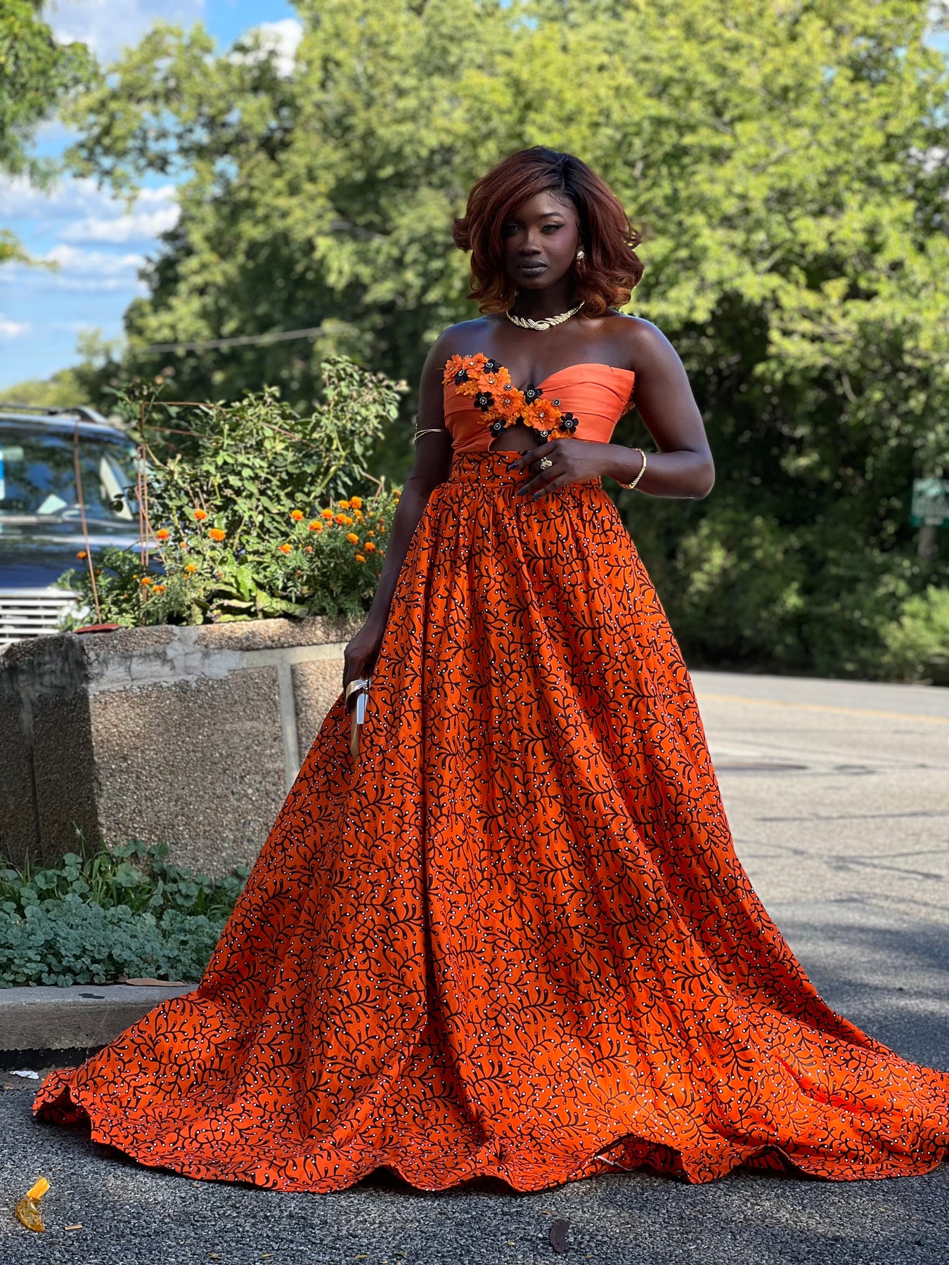 This stunning gown is the definition of timeless African luxury. Handcrafted with exquisite detail, the bodice features a structured corset design that enhances the figure while offering a flawless, contoured fit. The vibrant African print fabric adds a bold cultural statement, marrying tradition with sophistication.