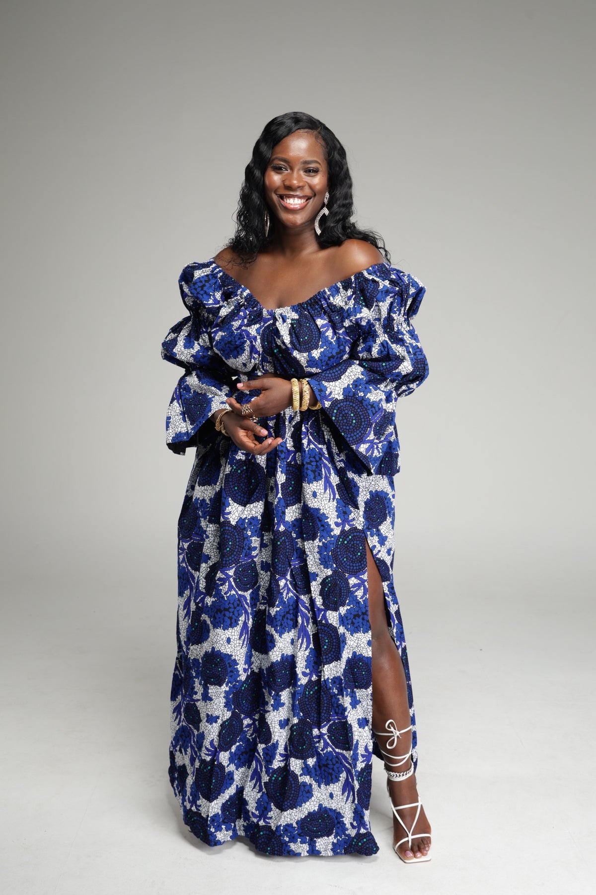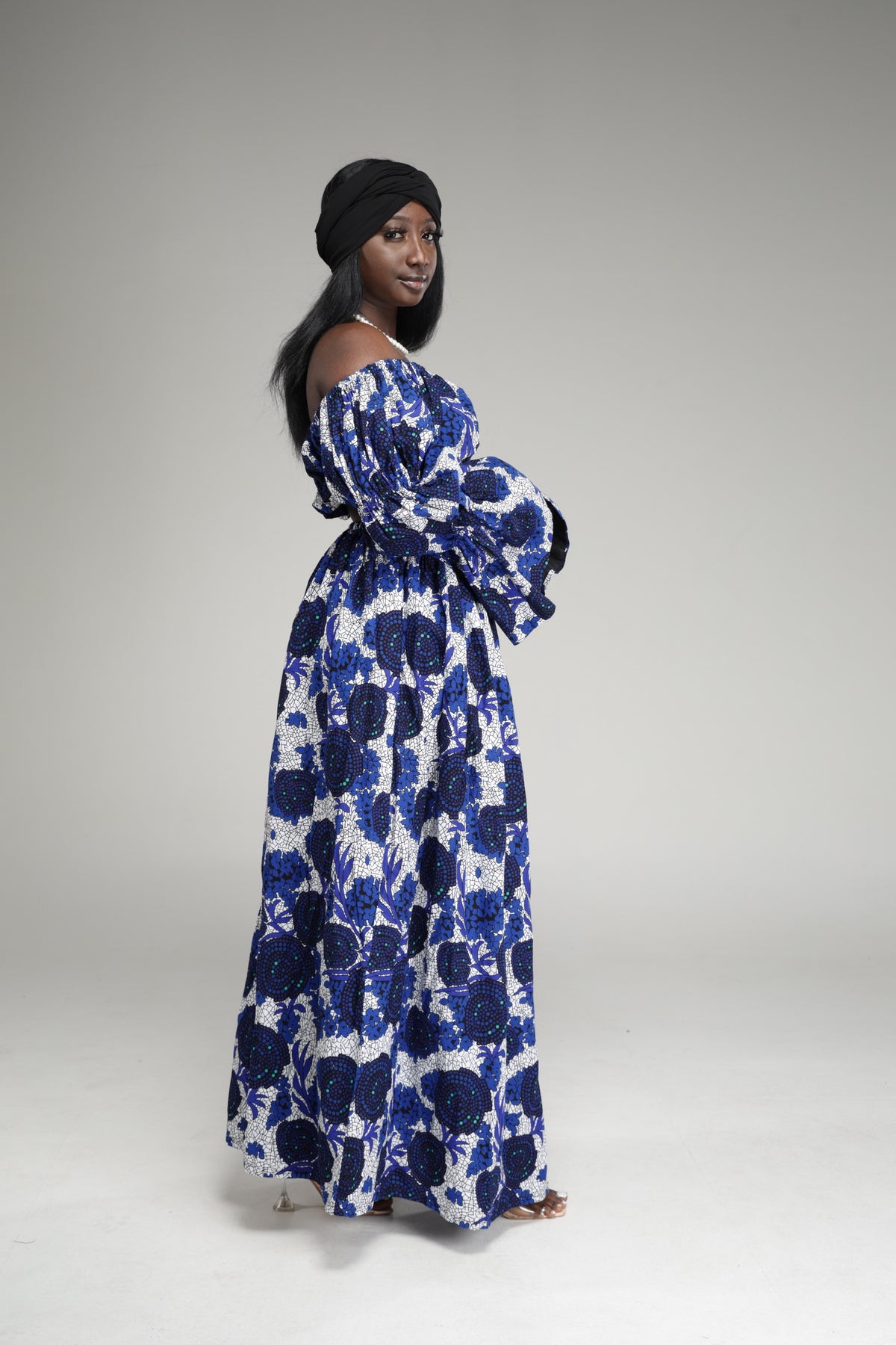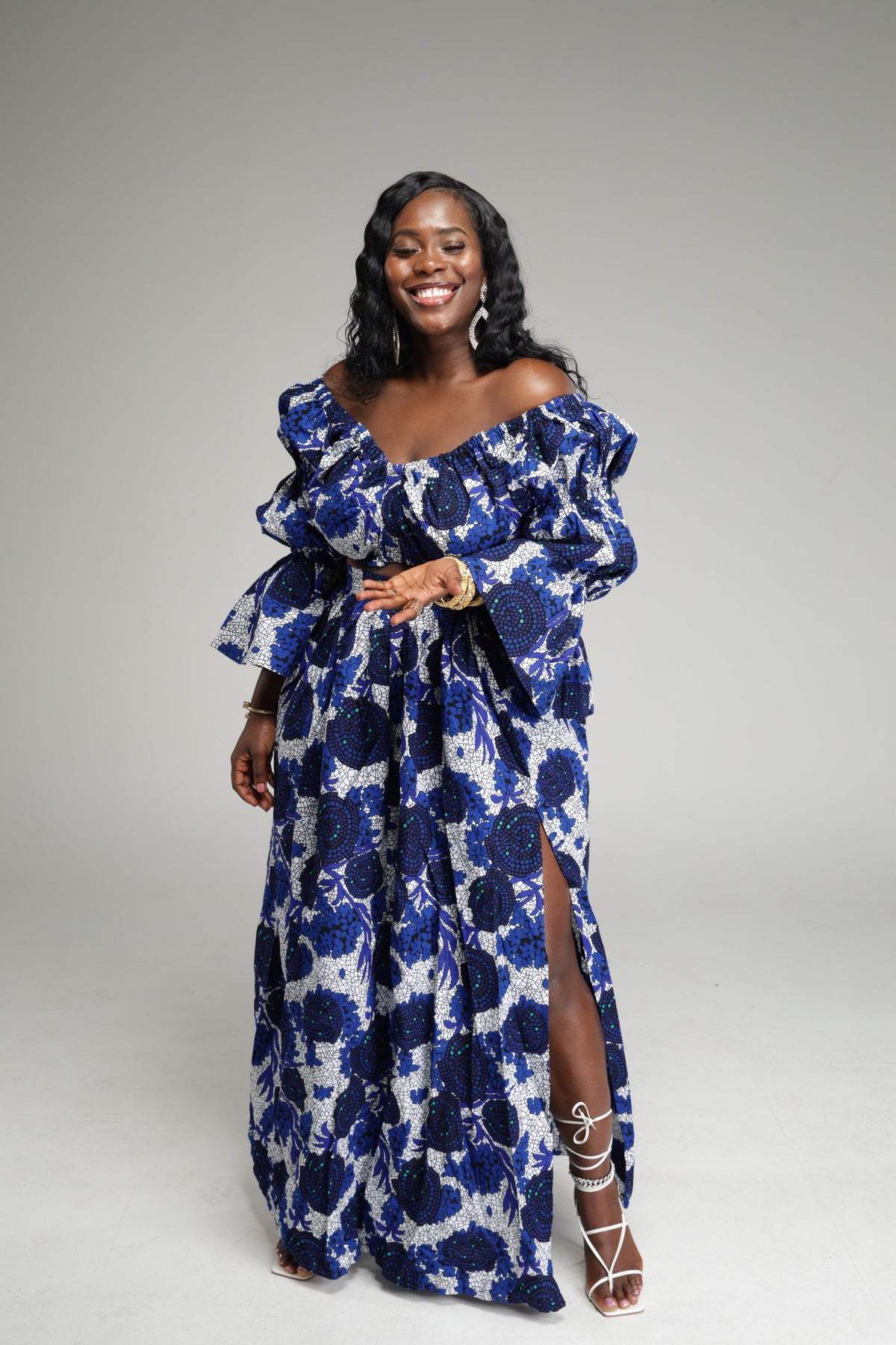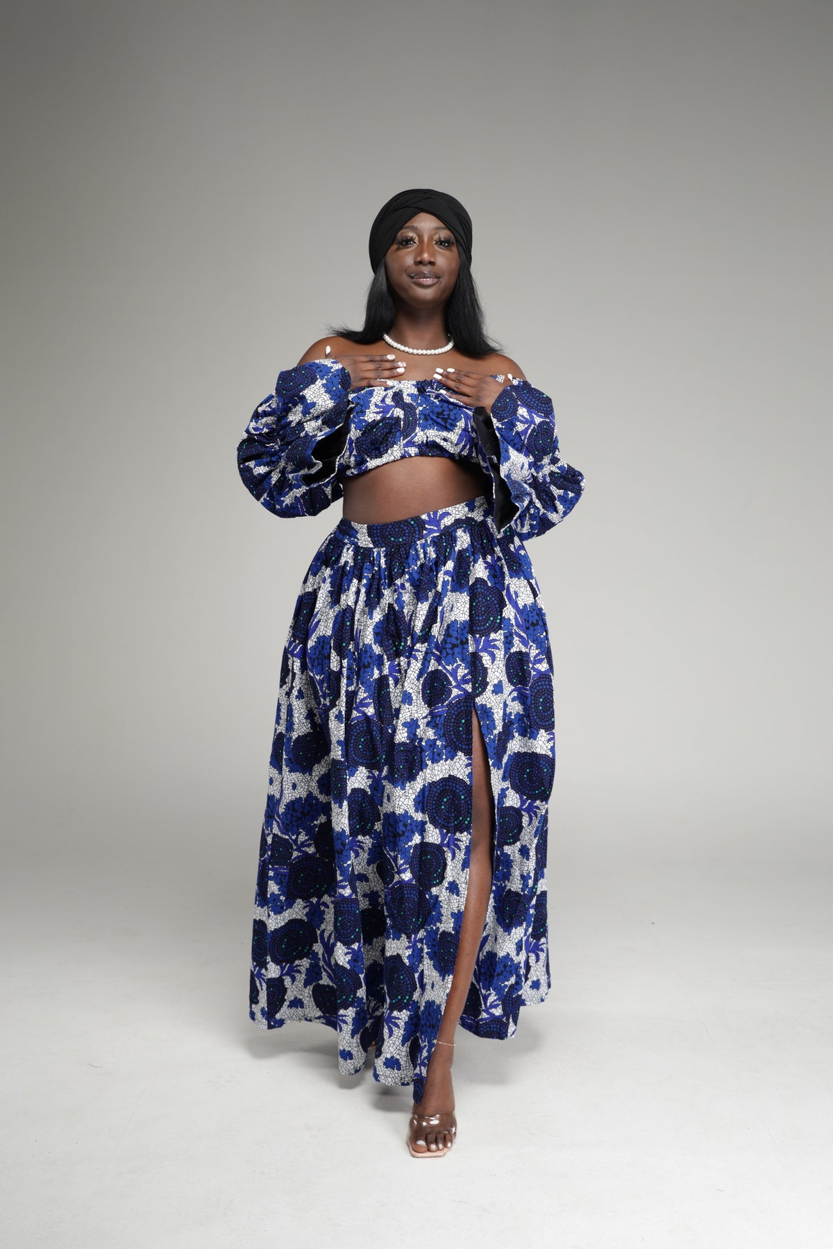This stunning 2 piece long sleeve off shoulder crop top and slit maxi skirt set is beautifully designed with authentic African fabrics, The top is designed to be long sleeved, off the shoulder and synched in the middle, also designed with elastic, this top gives the perfect fit. The maxi skirt is designed with a fitted high waist, for a snatched look, with a elastic in the back to snatch that waist. Also has a thigh-high side slit with two pockets on the side.